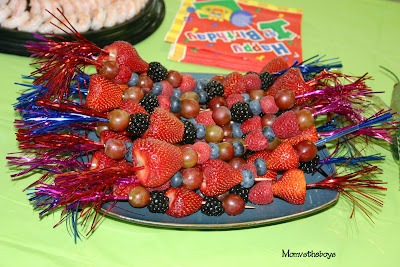I made these for Little Buddy’s party which had a larger gathering. I had always intended to give these a try and found these fun little party skewers while perusing the dollar store. I couldn’t tell by the packaging what they were exactly, but they turned out to be just what I was looking for. A short wooden skewer with a fun sparkly end to do fruit kabobs with.