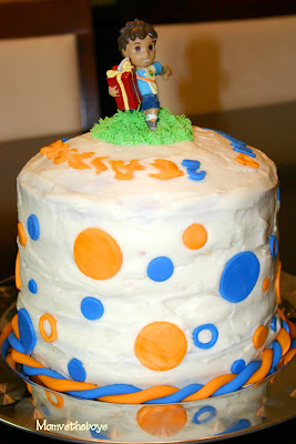 Frost the entire cake and decorate any way you like. I used fondant coloured orange and blue, cut out circles for the sides and each boys name and age for the top (blurred for privacy). I used a Diago candle and piped grass with the [easyazon_link identifier=”B00DSPAW3Y” locale=”US” tag=”m0dd5d-20″ localize=”y”]wilton grass tip[/easyazon_link] around the bottom of the candle.