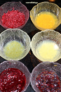 In the third bowl, mix blackberries and 1/4 tsp purple food colouring.