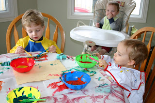 Every once in awhile we like to GO BIG! There are occassions when a card simply won’t do! you need to just shout it out! I have the boys put their creativity to work to paint Big murals. Big Brother loves to paint, Middle Man loves to eat paint! lol They go to work on a large piece of paper. The key is to not let the middle get coloured, because that’s where you’ll want to write your message. I use a bit of ‘sticky tack’ (reusable adhesive) to hold down an 81/2 x11 sized piece of paper right in the center. The kids can get paint on it and when they are done it just lifts right off.