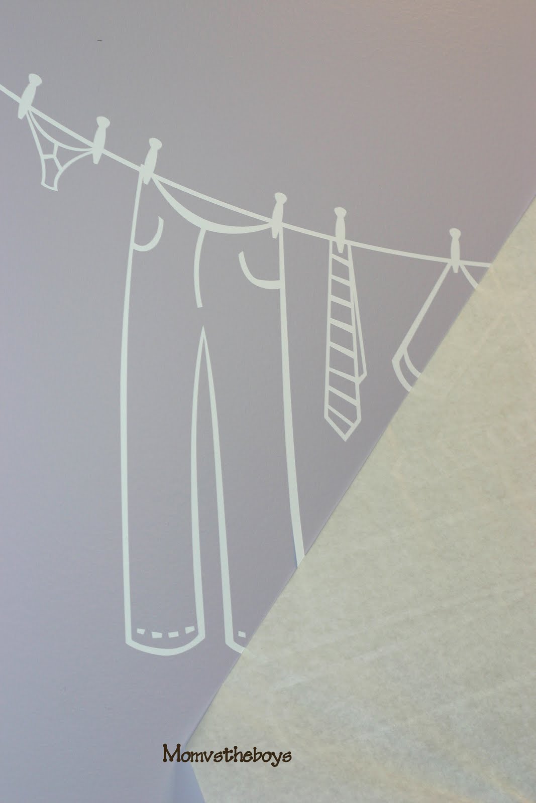 In the end I chose a super cute clothes line graphic. So fitting for the laundry room wall. I had a fair size wall to work with for such a small room, so I was able to order the large size which measures 32″ w x 20″ h. Since the room was purple with white appliances and shelves I stuck with that theme and choose white for the colour. I could have easily chosen any colour of the rainbow though, Right On The Walls has a wide range of colours to choose from.