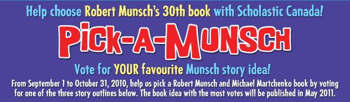 To celebrate Robert Munsch’s 30th book with Scholastic Canada, fans are getting the opportunity to decide which story will be published in May 2011! How cool is that!