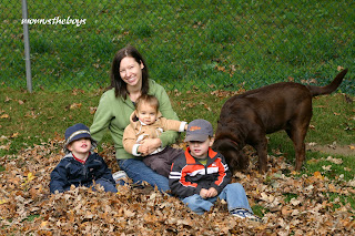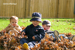 Saturday was a cool but nice day and we got out for a couple of good plays in the backyard. The leaves are starting to fall and we made a good pile of them to jump in! Daddy, Big Brother and Middle Man each had their own rakes and the boys would make a pile only to destroy it and rake it up all over again! Little Buddy wasn’t a big fan of the leaves, he scrambled out of the pile as quickly as I could put him in it. I tried to get a great shot of all the boys in the leaves, but as always, they were unwilling to co operate.