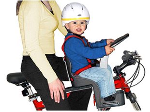 At first glance, I thought it might be difficult to ride with the seat between my legs, but it really isn’t. It’s still very comfortable. My bike has a style that was designed for comfort, so the seat is a tad lower and the handlebars higher. For this reason, the front rest for the child sits right between the handles of my bike and I have to watch for little fingers when my handlebars are turning so they don’t get pinched. But most bikes are not set up this way and you will see from the website photos below that the child rest normally sits much higher.