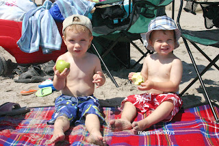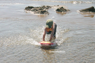 This particular day was really great because a sandbar had developed really close to shore. The boys had a blast playing in between and the water was so shallow we didn’t have to worry as much. Big Bro took his new kickboard out past the sand bar with Daddy to play in the waves a few times and loved it!