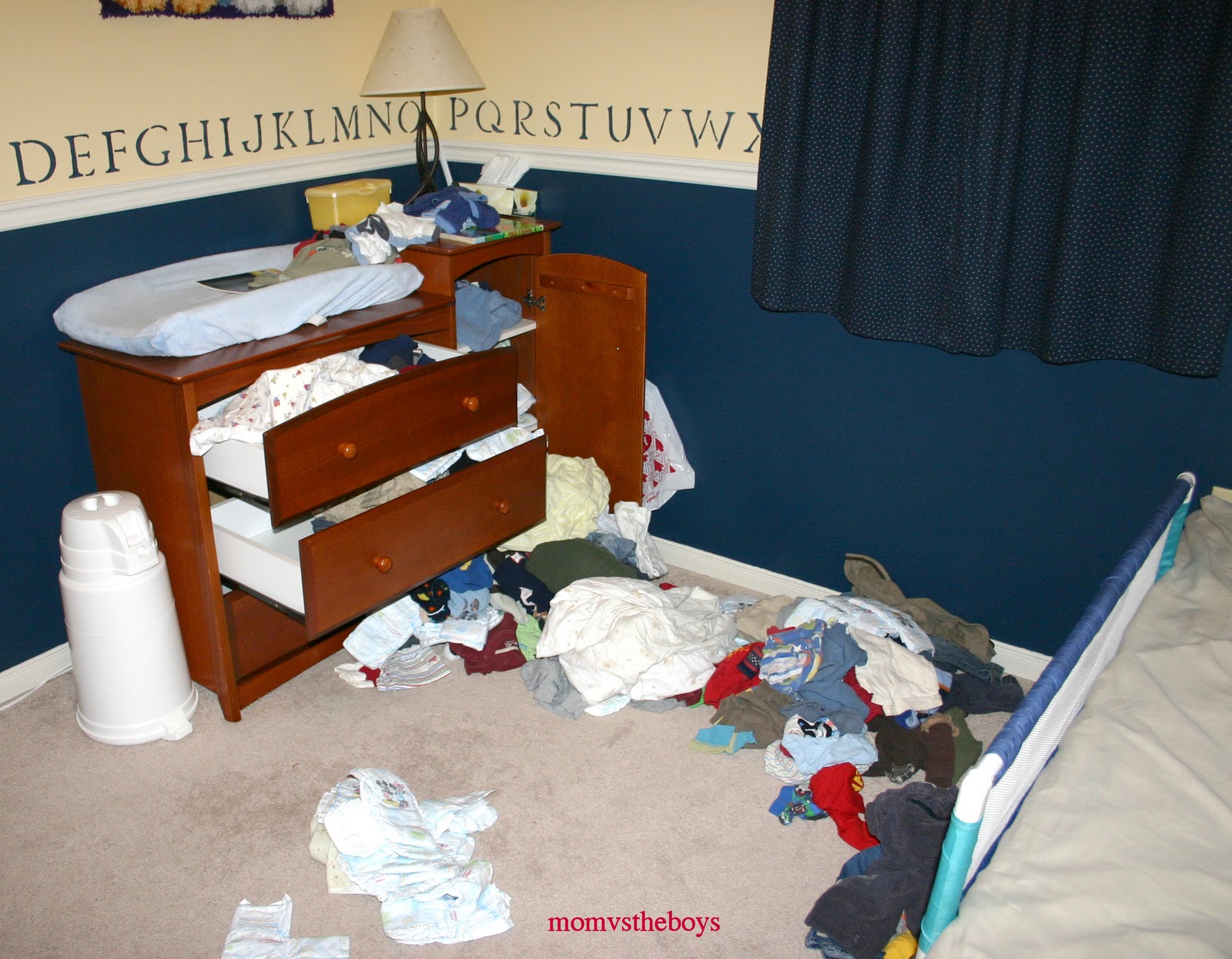 Ohhhh he was ticked off all right. He trashed his room! He tossed clothes, diapers, sheets all around the room! The items you can see in the drawers, don’t belong there. He mixed the whole dresser up and it took a good while to reorganize and put back the whole mess. Of course this was nothing compared to the day he turned 2, but a show of revenge none the less.